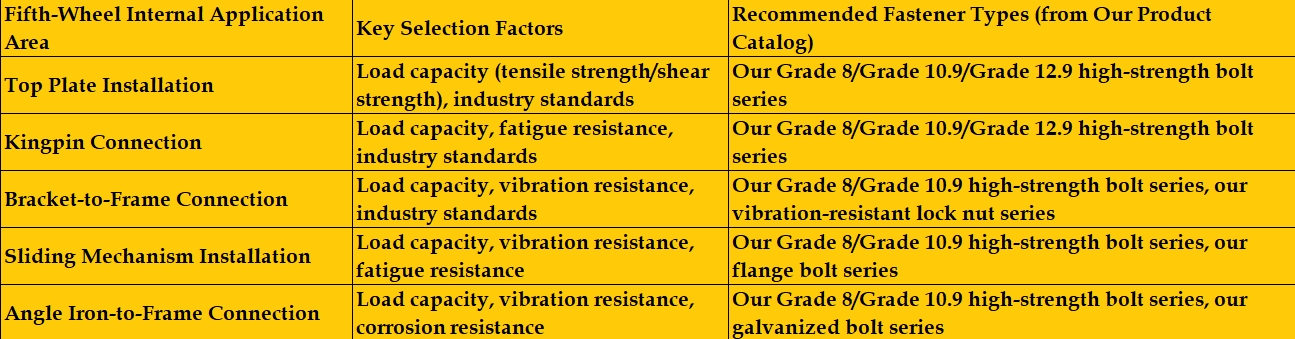 المركبات التجارية ، وخاصة نصف المدونات ، تولد اهتزازات كبيرة أثناء التشغيل. بمرور الوقت ، يمكن أن تتسبب هذه الاهتزازات في تخفيف السحابات ، وبالتالي تعرض سلامة اتصال العجلات الخامسة. الاهتزاز يمثل مشكلة رئيسية للمركبات التجارية ويمكن أن تؤدي إلى فشل السحب. يشير هذا إلى الحاجة إلى آليات القفل أو السحابات المصممة خصيصًا لمقاومة التغلب. نوصي باستخدام القفل المكسرات (بما في ذلك تلك التي تحتوي على إدراج النايلون كما هو مذكور في بعض المراجع) ، ومسامير شفة للحفاظ على اتصالات آمنة في بيئات العتيقة عالية.